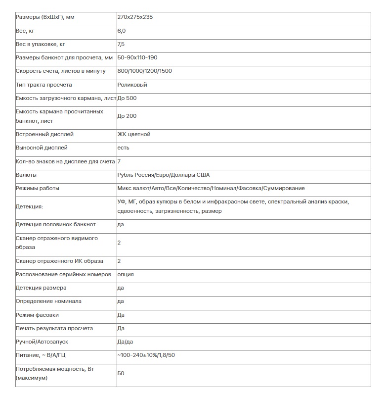 | Скорость счета, банкнот/мин | до 1500 банкнот/мин. |